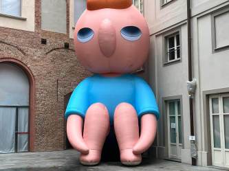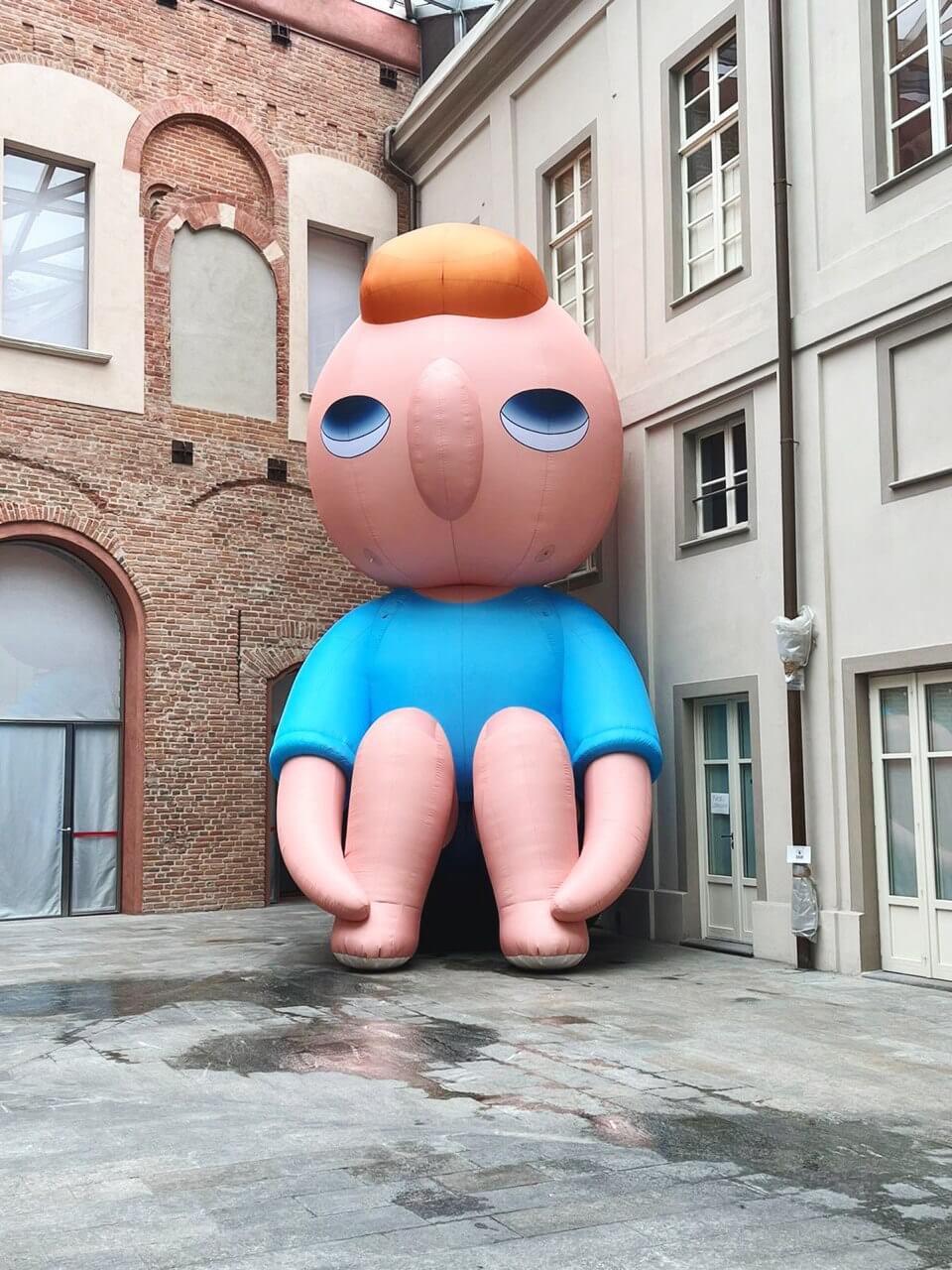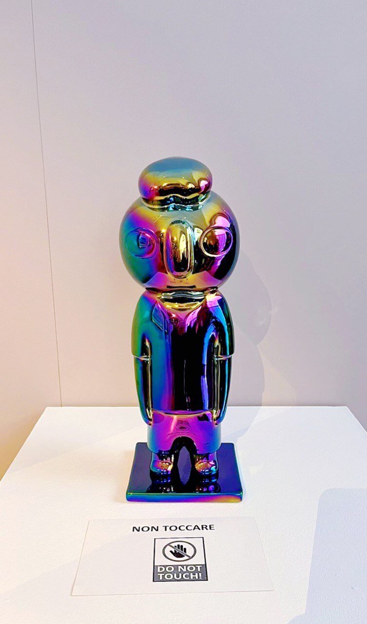 维图斯宫的庭院中,展览的主角、近 8 米高的 yy 充气雕塑坐在其间,巨大的人偶双手抱膝,一如往日没有嘴巴和耳朵,与展览主题《沉默的存在》相呼应,这种形式上的“止语”和 yy 澄明的智慧形成张力,他孤独地俯瞰世间,以深邃的蓝色眼睛注视着时移世易。本次展览以雕塑为主,走出二维空间的 yy,在形式上也脱离了画面中的语境,而进入一个更加独立的存在状态,不锈钢、铸铜烤漆、陶瓷炫彩和陶瓷法华彩等材料和色彩构建出斑斓的 yy 本体。通过这种方式,yy 将画面中的语境平移到现实世界中,观者成为与 yy 互相注视的对象,新的展览空间与文化氛围则构成 yy 的精神土壤,作为世界语言的 yy 也因此焕发出新的语义。