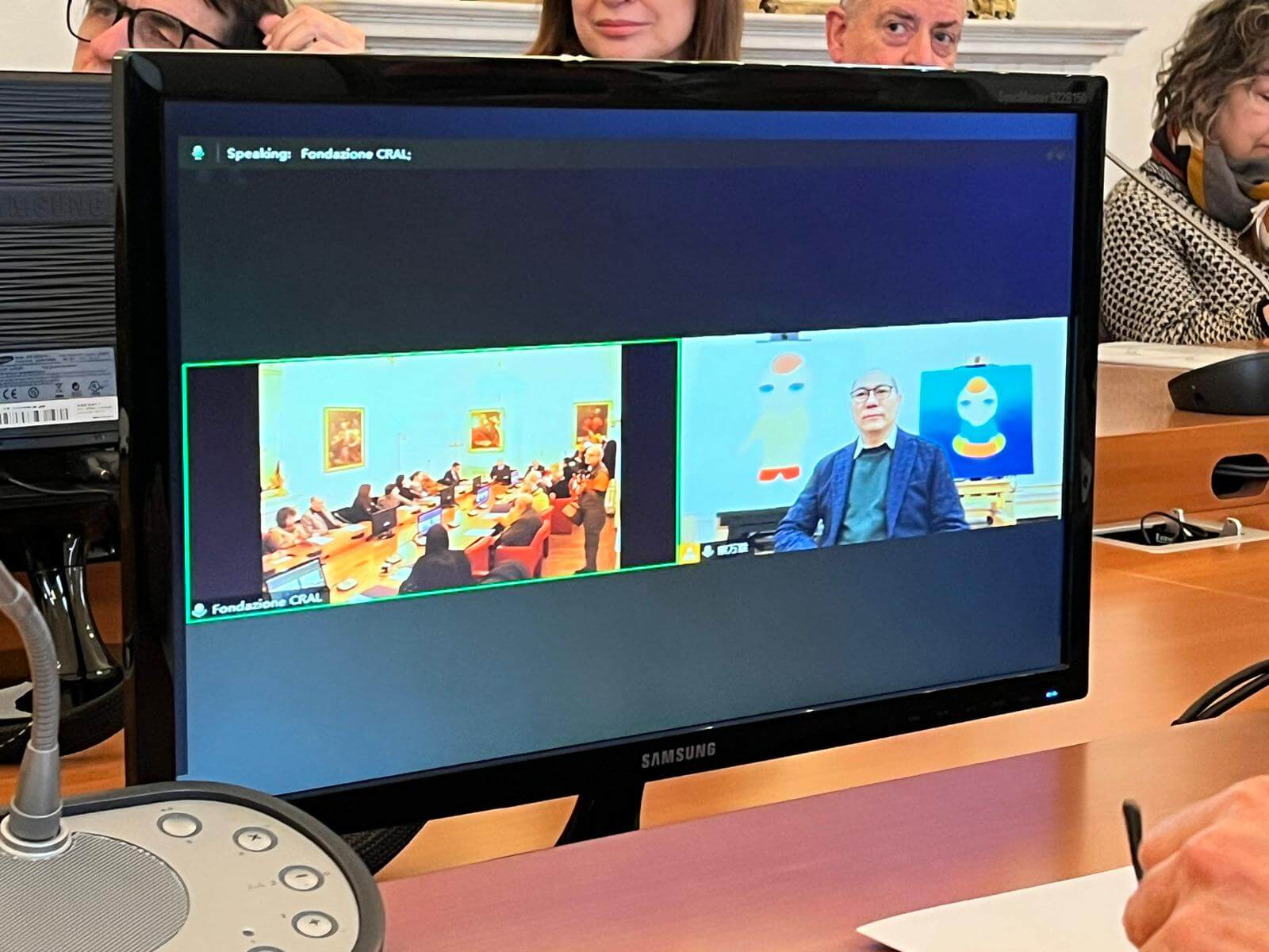 意大利亚历山德亚金融资产管理基金会还为展览举行了两场专题研讨,艺术家蔡万霖通过连线与国际嘉宾分享了自己的创作经验,yy 在诞生之初,是对自身的追问:我从哪里来,要到哪里去。“我在禅修的过程中就是不听不言,这个形象进入社会的时候引发大家的共鸣,有时社会现实场景会出现在我的作品中,这是当代艺术对现实问题的观照。”这正是 yy 成为国际语言的重要原因,当艺术家从自身的感受出发,并通过修行将自己与众生融为一体,yy 也便成为众生心灵表征的导体。